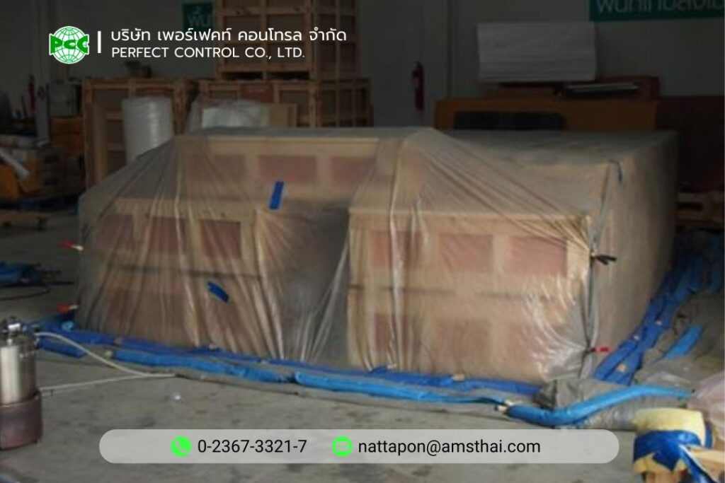 2. ปิดคลุมพื้นที่สำหรับการรมยา ลังไม้หรือสินค้าจะถูกคลุมด้วยวัสดุเฉพาะเพื่อควบคุมการกระจายของสารรมควันให้มีประสิทธิภาพ